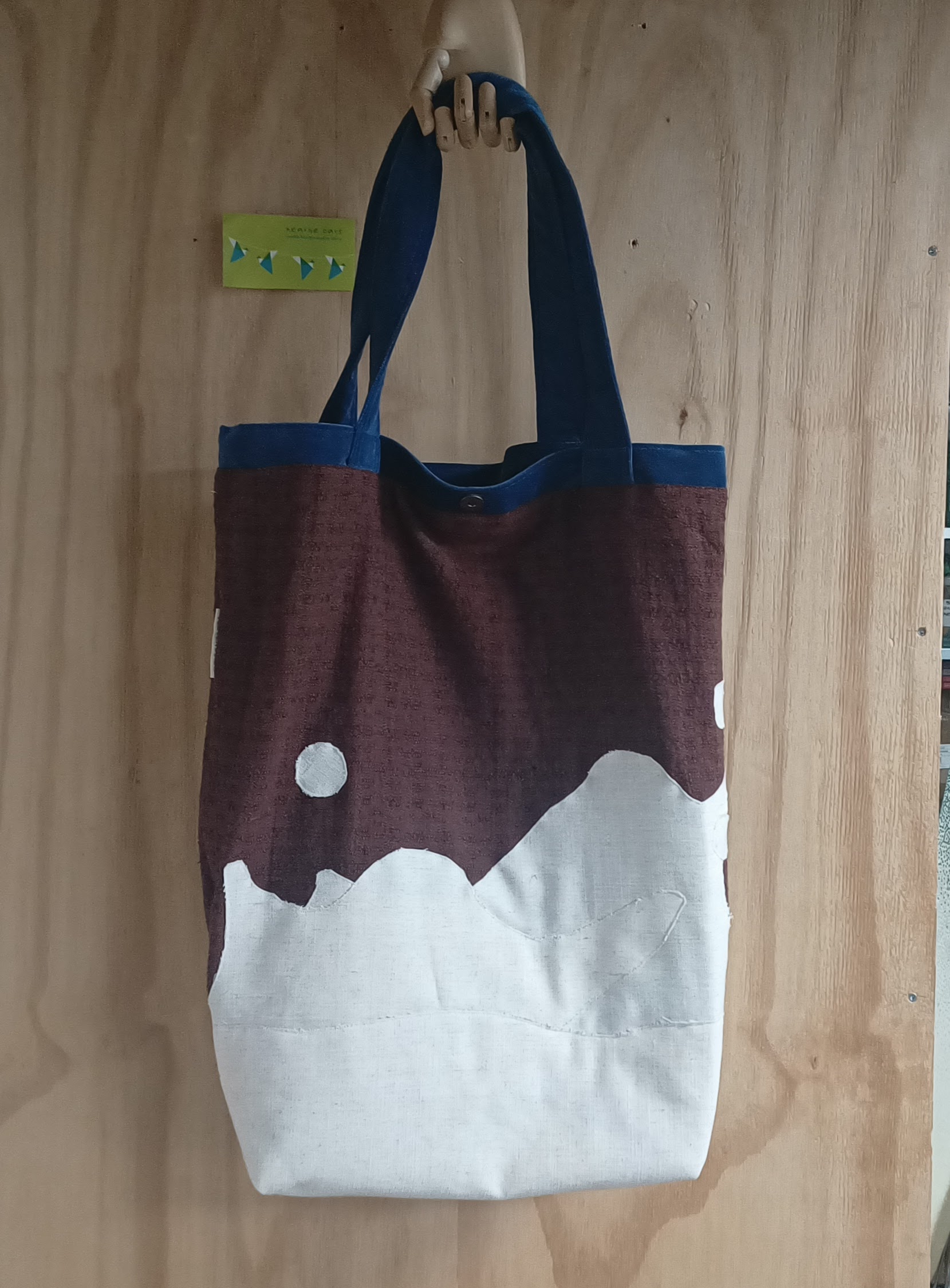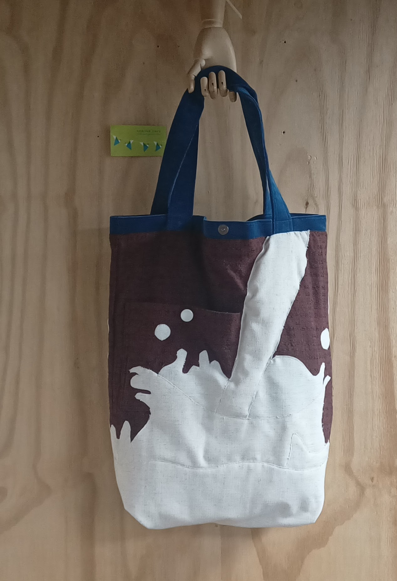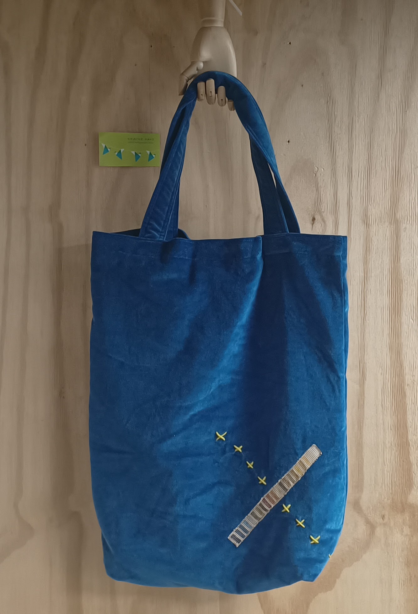 Deze grote shopper is gemaakt van een borduurwerk, velours gordijnstof en verschillende soorten gordijnstof.