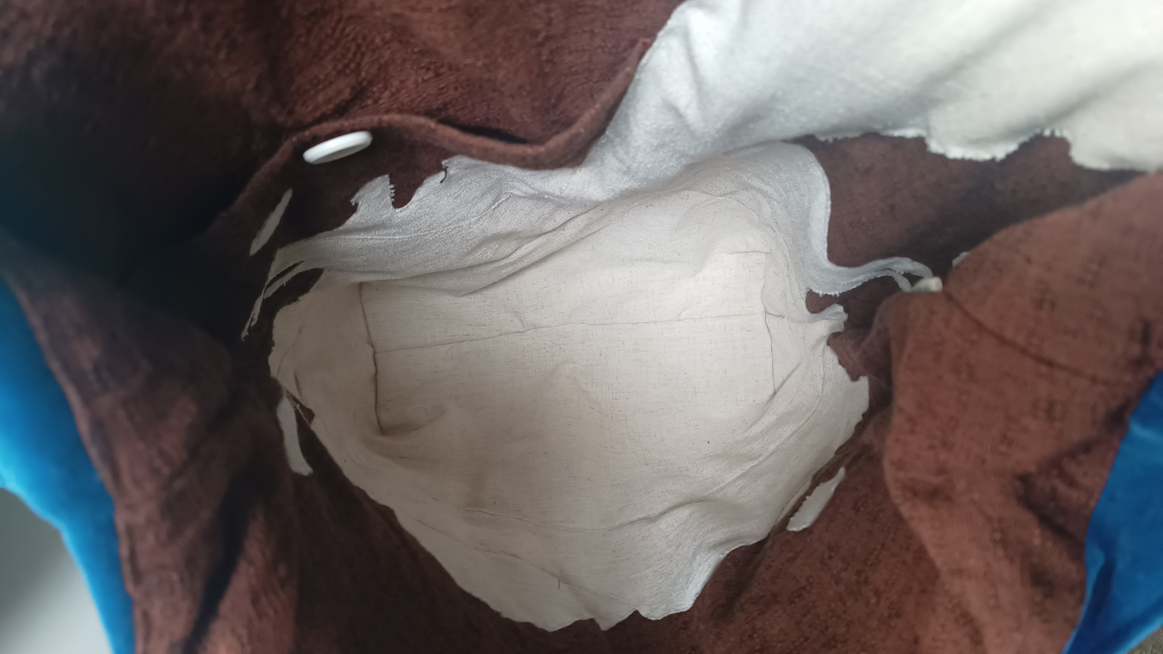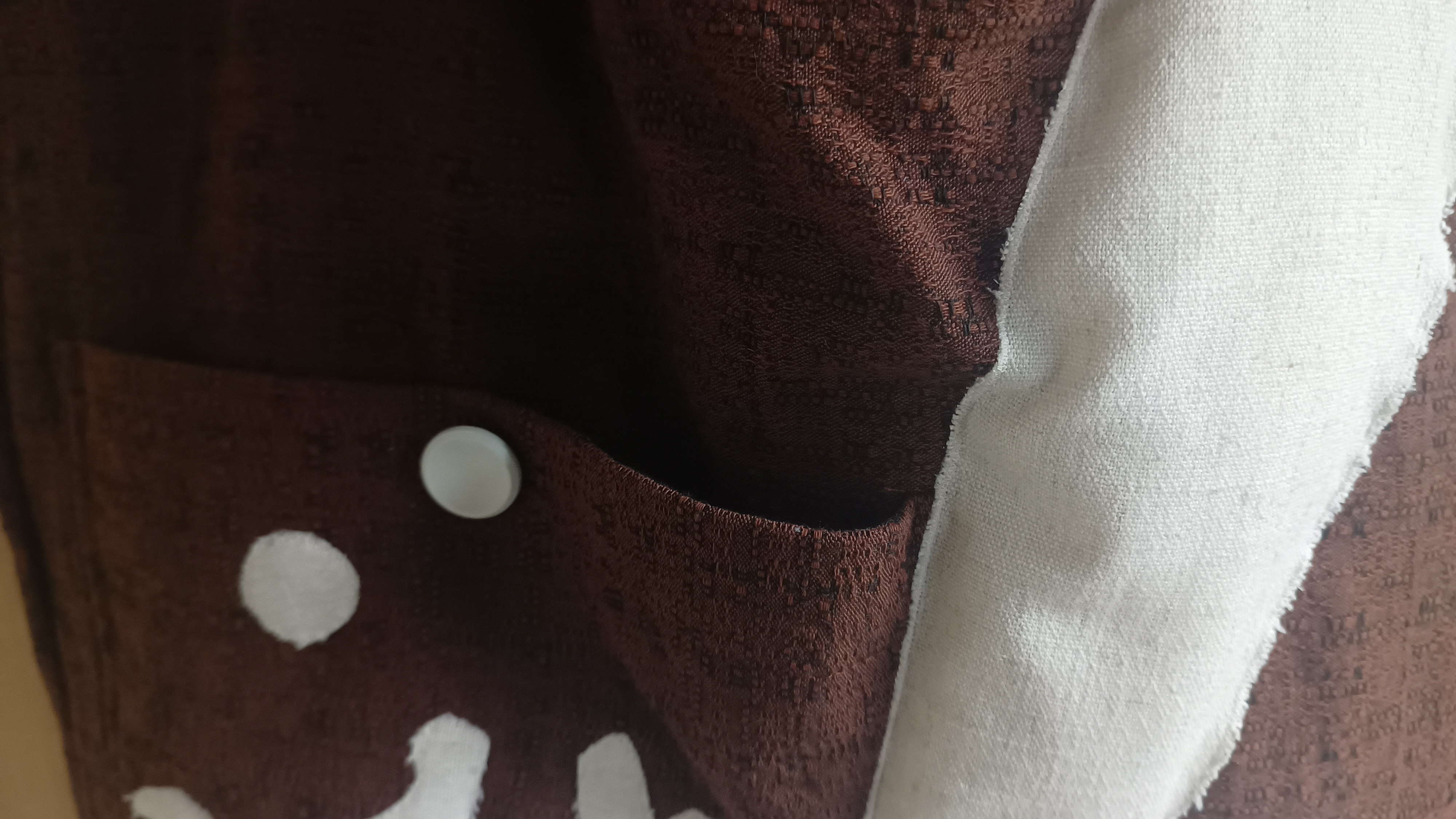 De binnenkant is zo gemaakt dat het lijkt alsof er melk geknoeid wordt en dat de melk opspat tegen de rand van de tas. De bruine kleur is het terracotta melkkannetje en het witte is de melk.