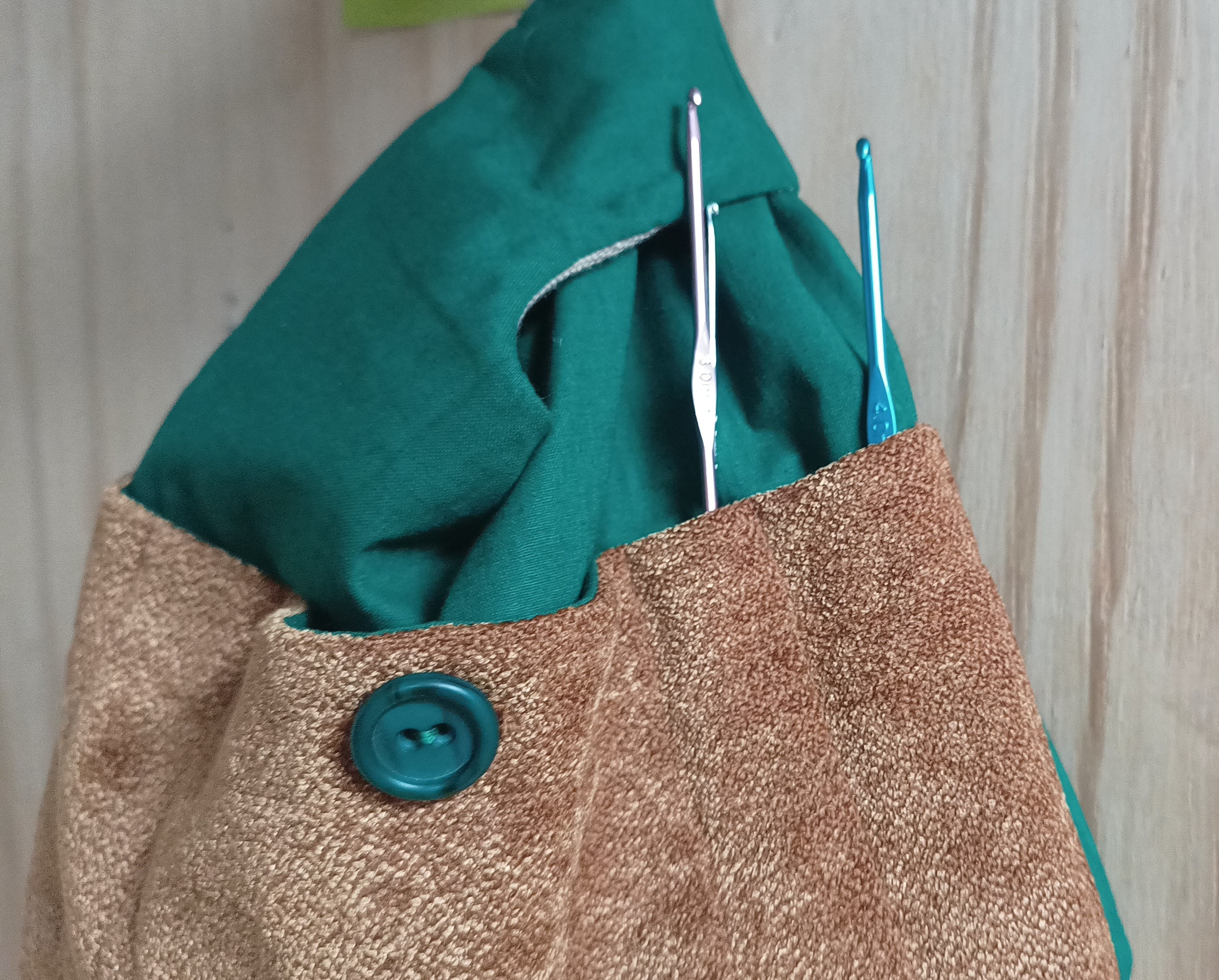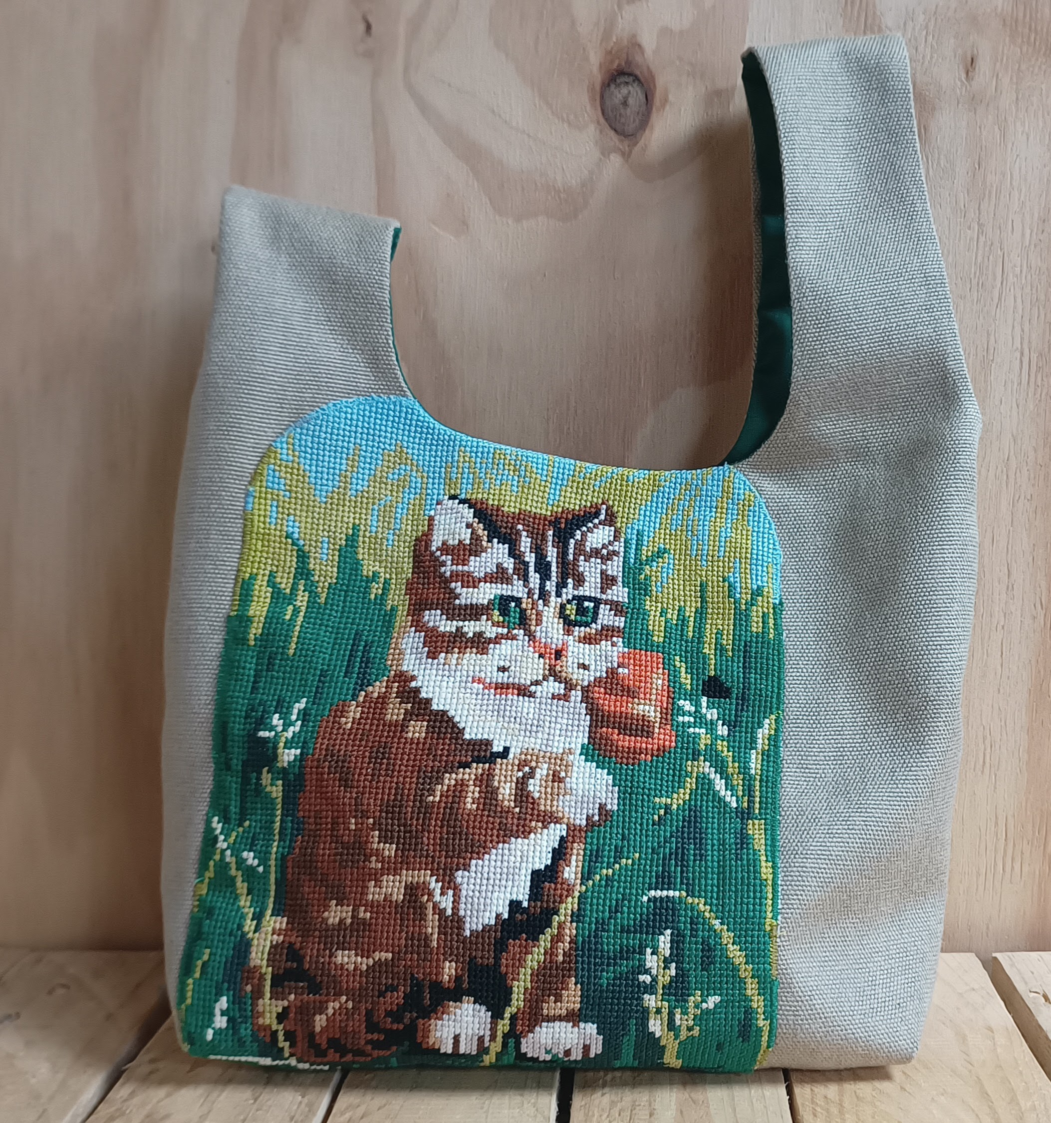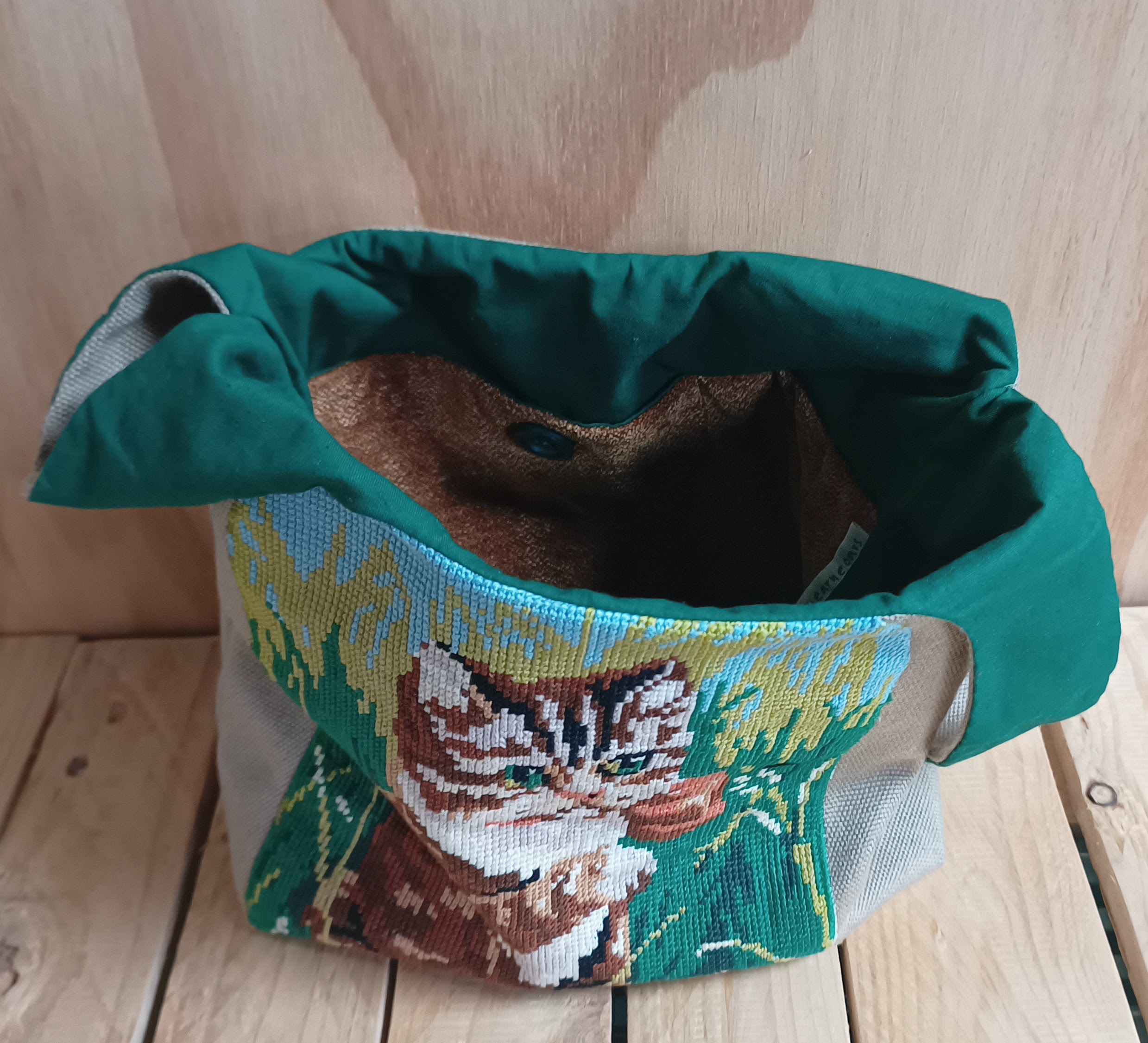 Deze tas is gemaakt van een borduurwerk, bekledingsstof en een katoenen stof. Aan de binnenkant voorzien van een zakje met knoop en een paar smalle vakjes bedoeld voor haaknaalden en of breipennen tot 20 centimeter.