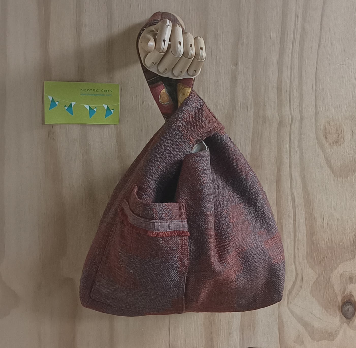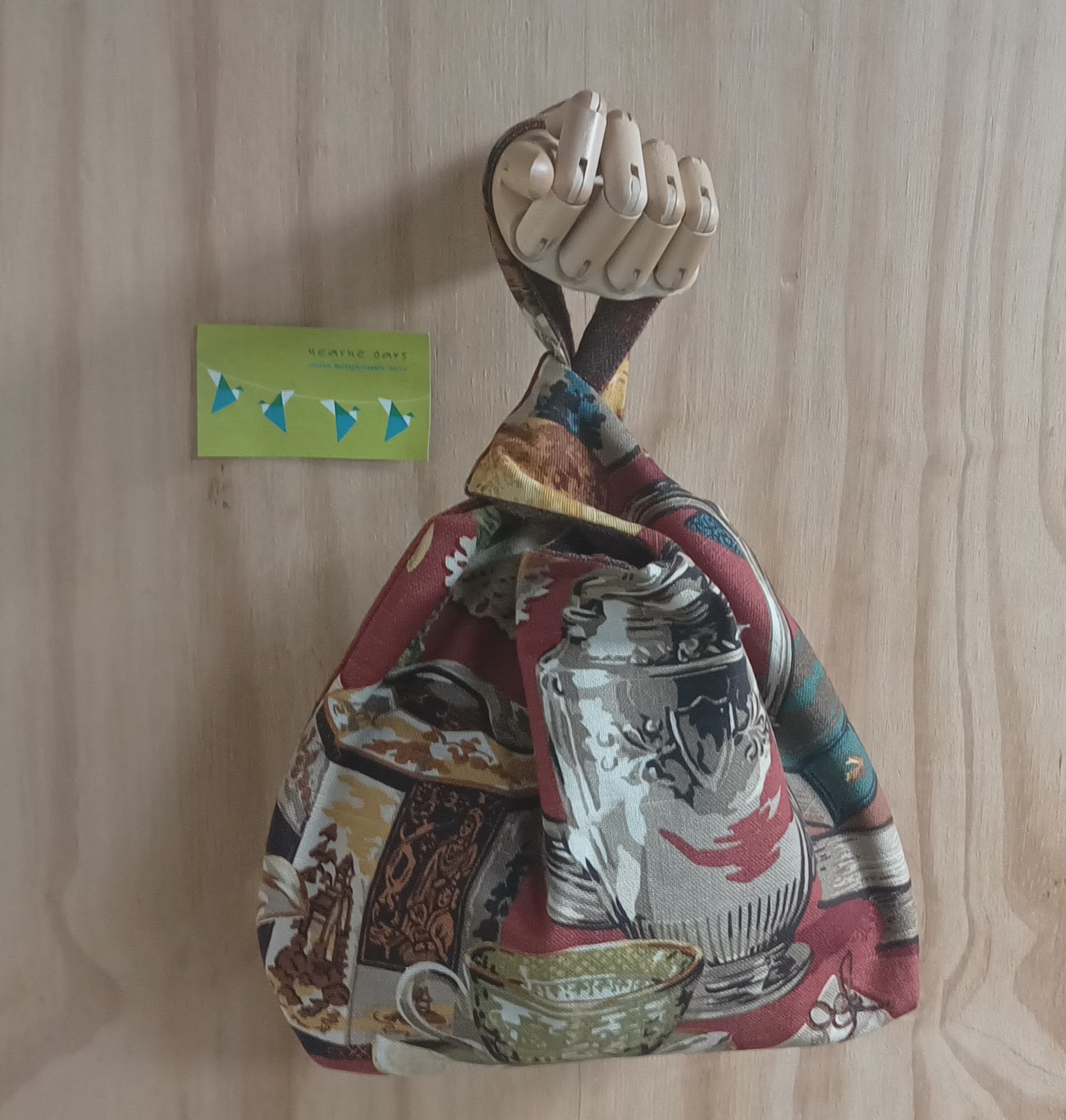 Deze japanese knotbag heeft twee grapjes. De eerste is dat het een theepot zakje heeft, het patroon loopt precies door zodat het zakje haast niet te zien is.