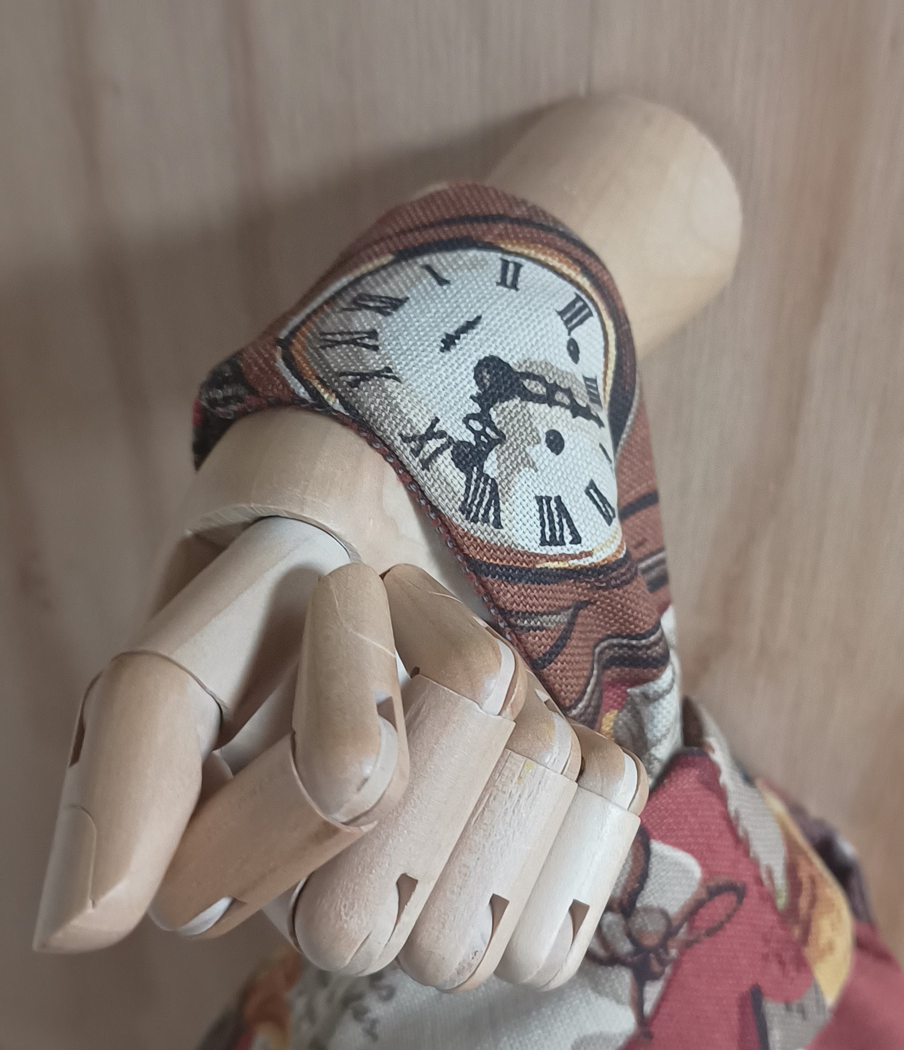 Het tweede grapje is dat als je de tas om je pols hangt dat het klokje precies als een horloge zit.