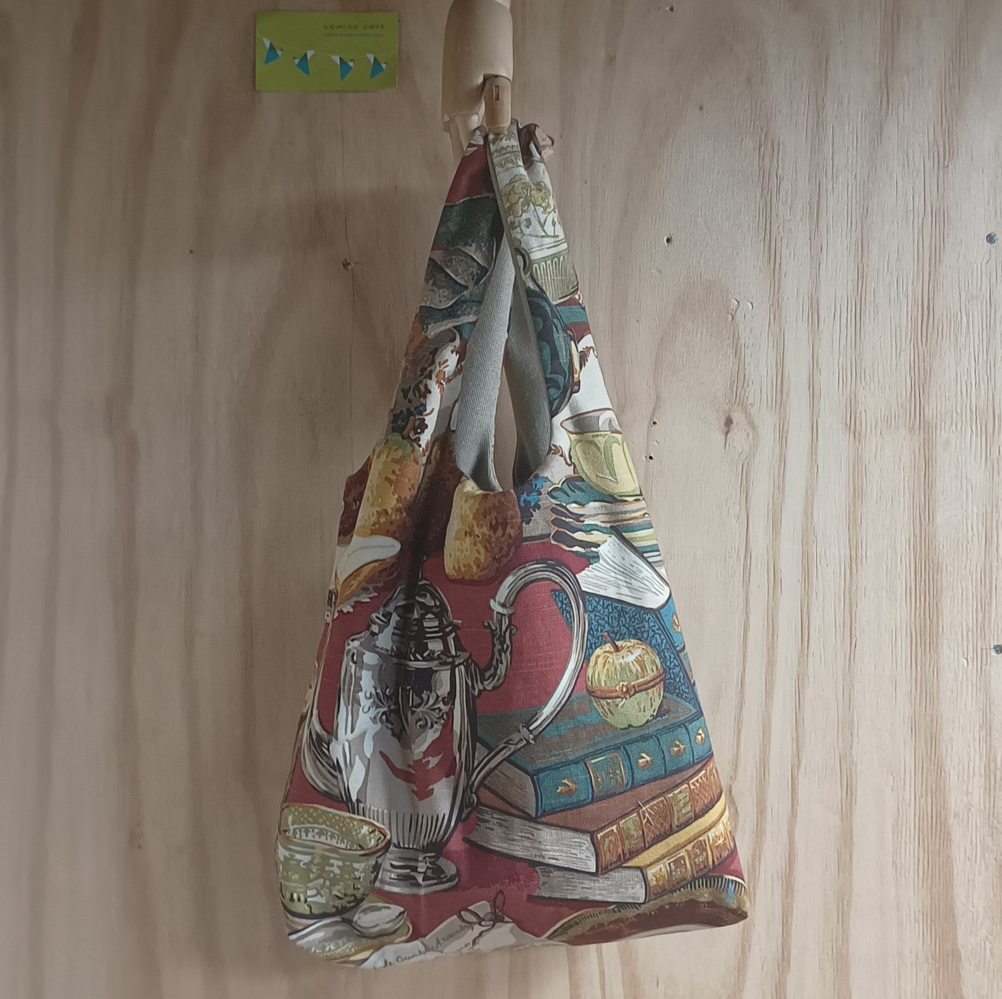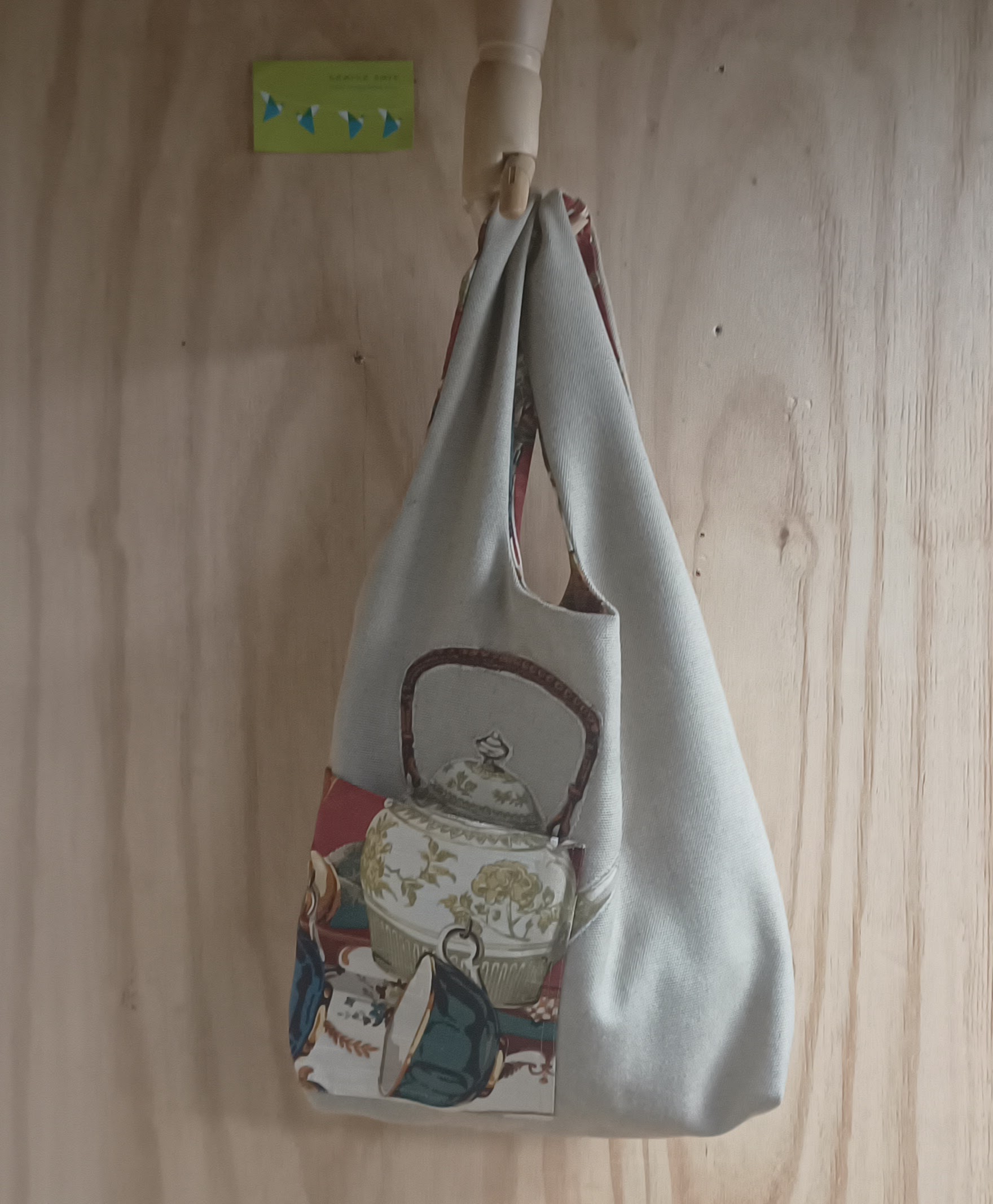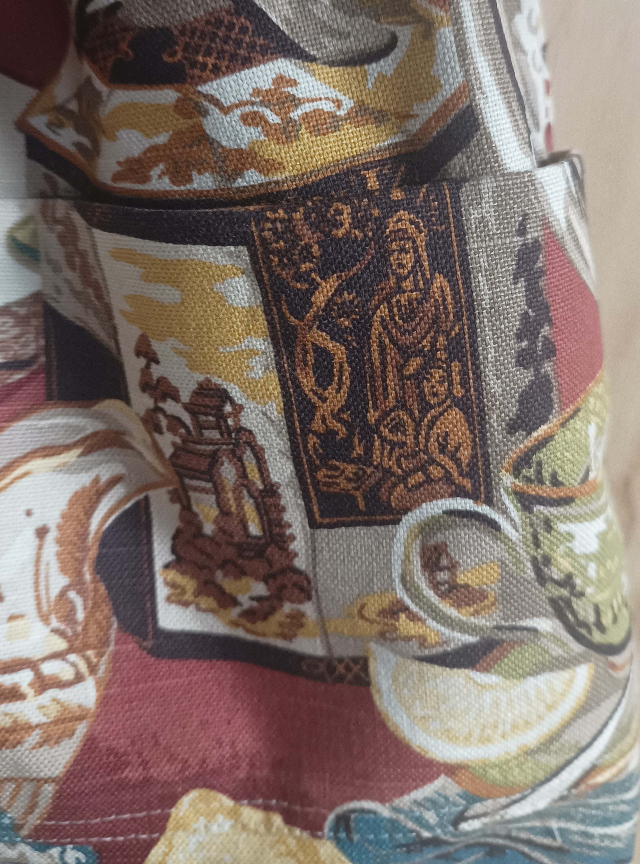Een tas met twee vakjes met als grappig detail dat de theepot en koekblik daarvoor gebruikt zijn. Bij het koekblik loopt het patroon precies door zodat het zakje bijna niet te zien is