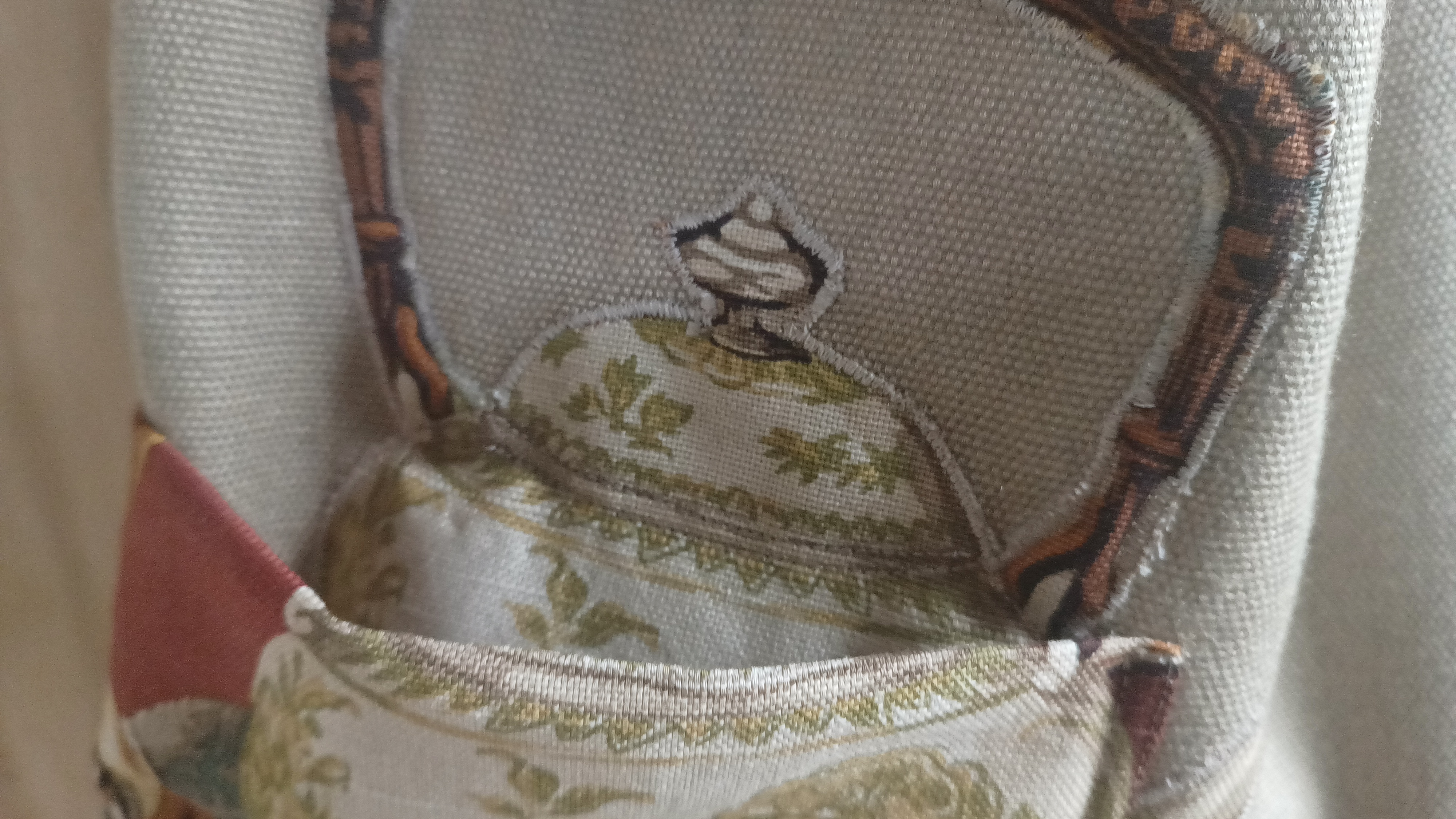 Deze shopper is gemaakt van oude gordijnstof in Engelse stijl met een rode ondergrond en meubelstof in een naturelkleurige linnenlook.