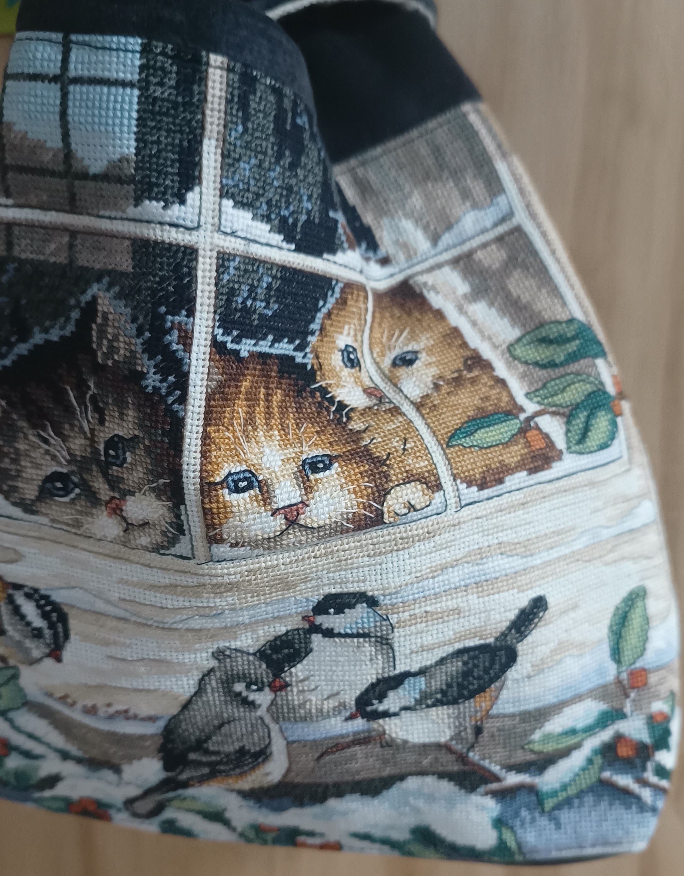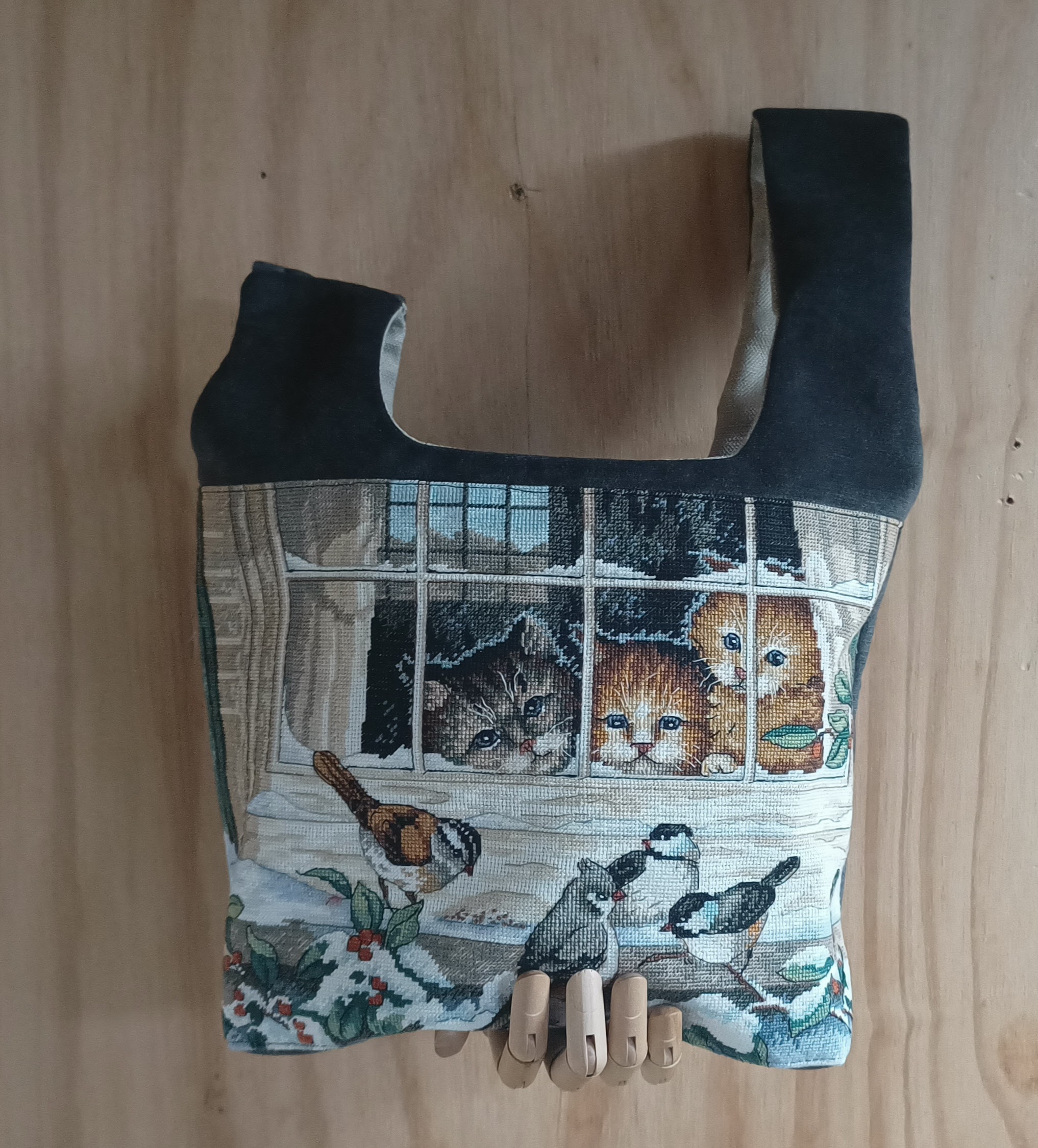Deze tas is gemaakt van een fijn borduurwerk, stevige antracietkleurige velours bekledingsstof en een gordijnstaal in het beige. Aan de binnenkant voorzien van een aantal vakjes bedoeld voor haaknaalden en of breipennen tot 20 centimeter en allerlei andere benodigdheden.