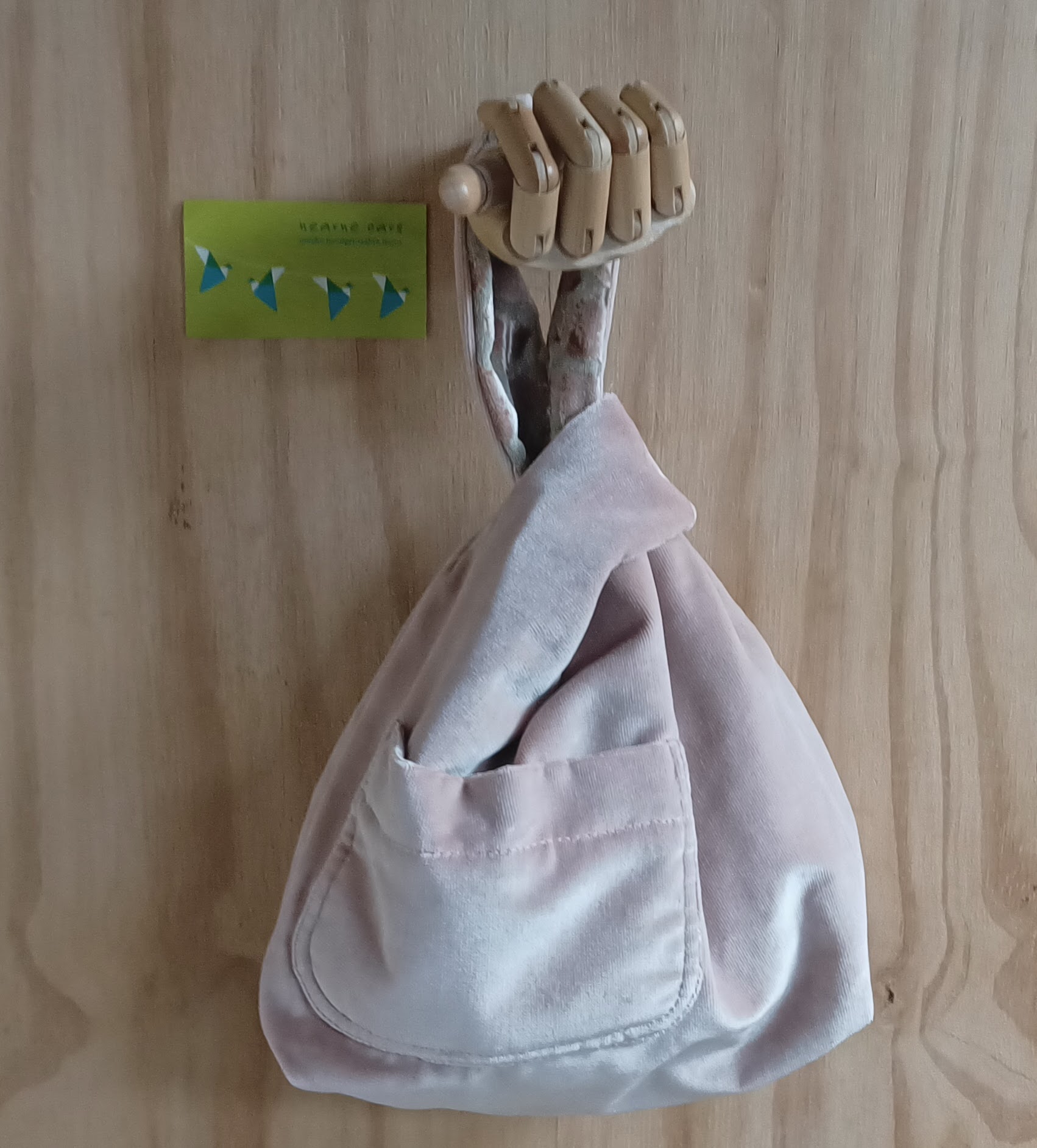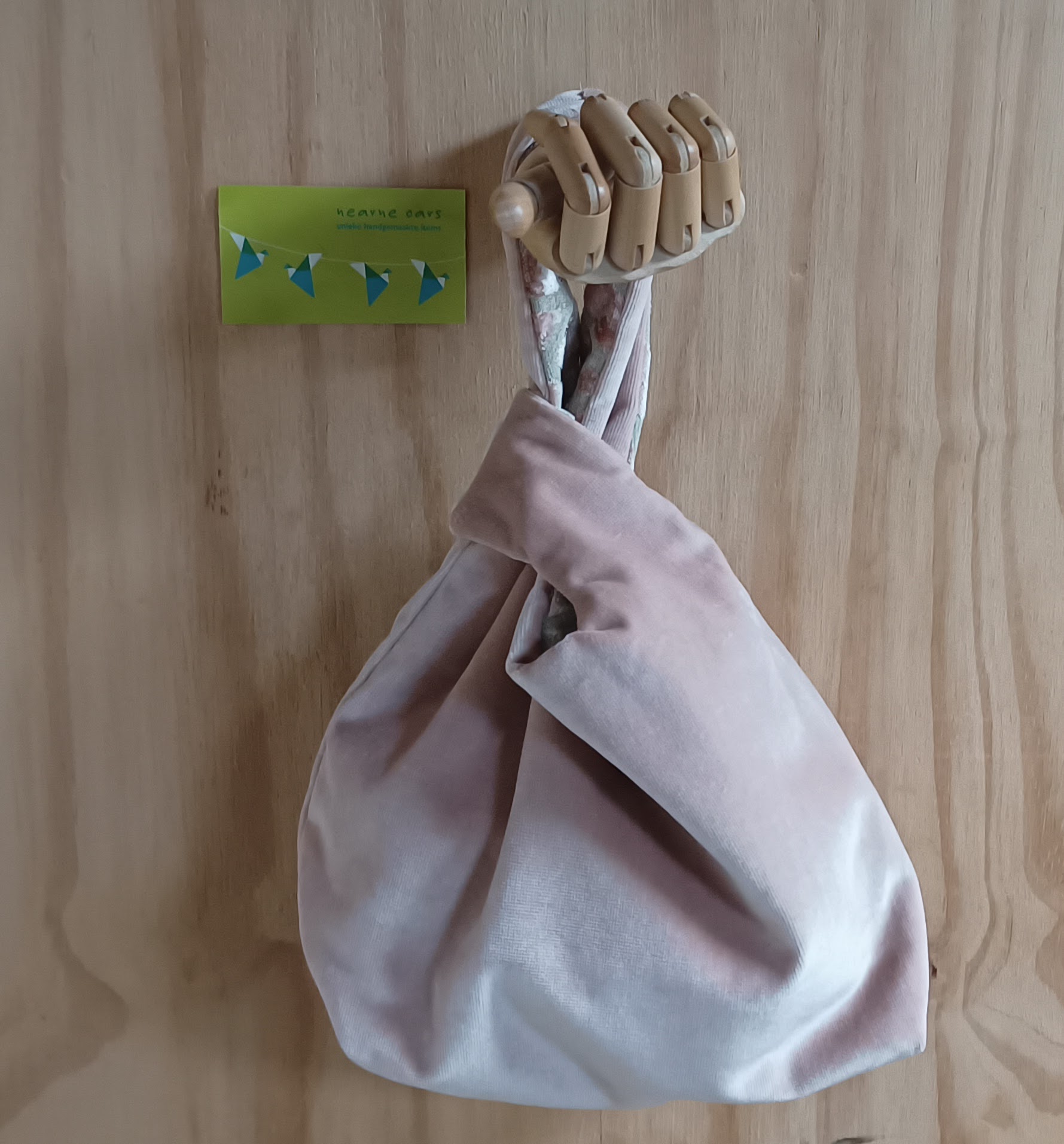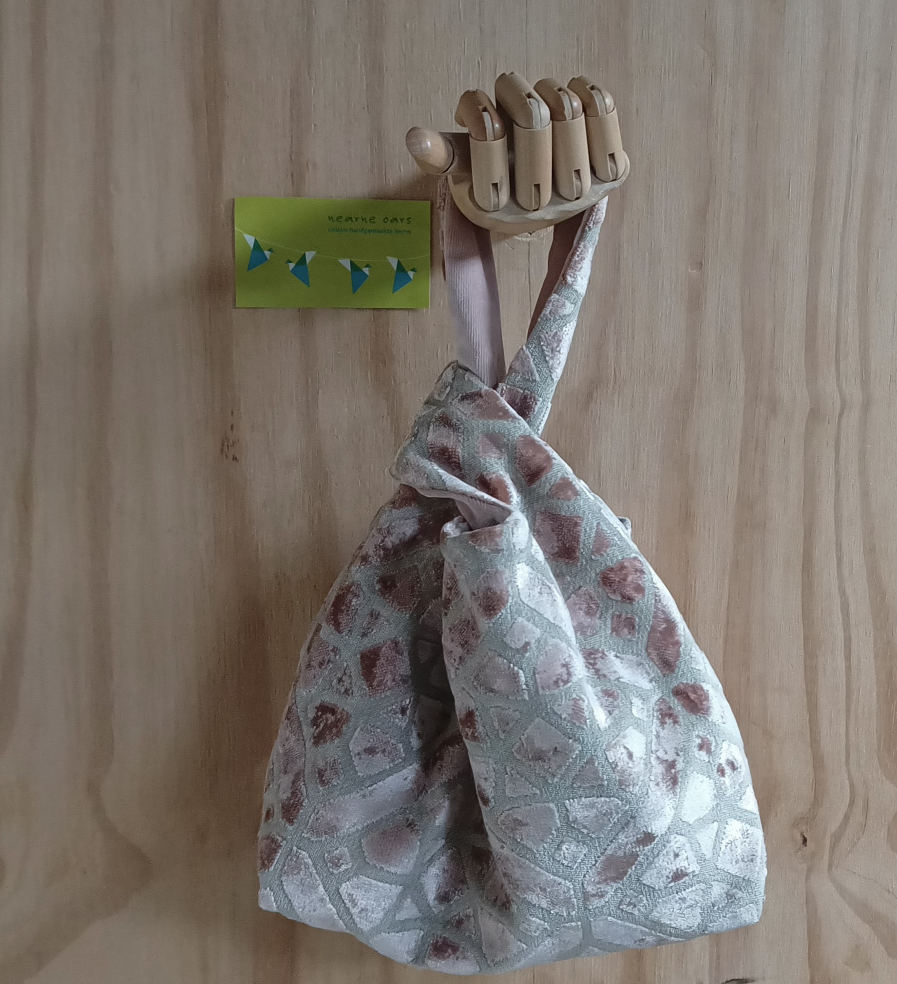 Deze japanese knotbag is uitermate geschikt om mee te nemen naar een feestje. Hangend om de pols of onderarm en je hebt je handen vrij. Het lange hengsel gaat door het korte hengsel en de tas sluit als vanzelf.