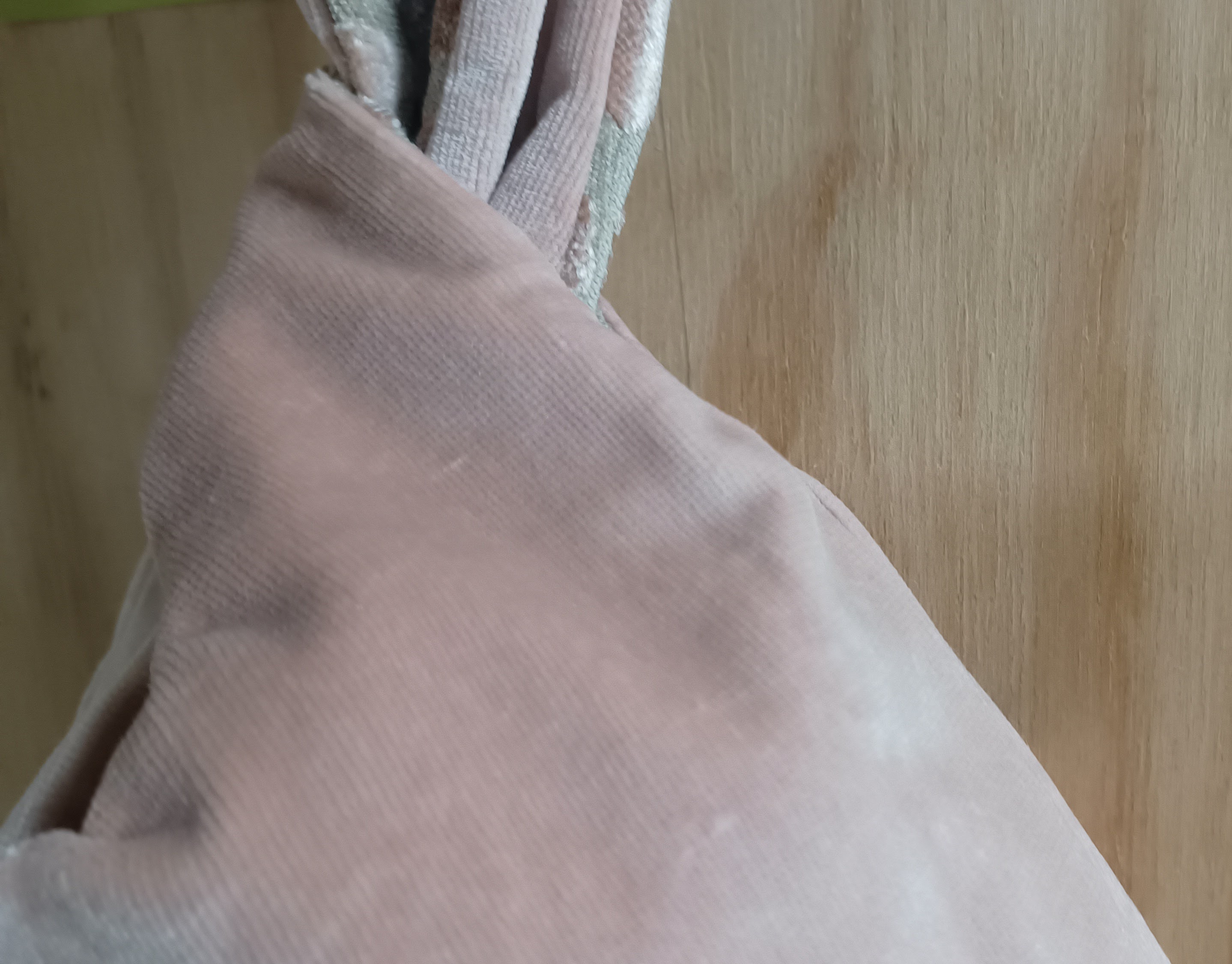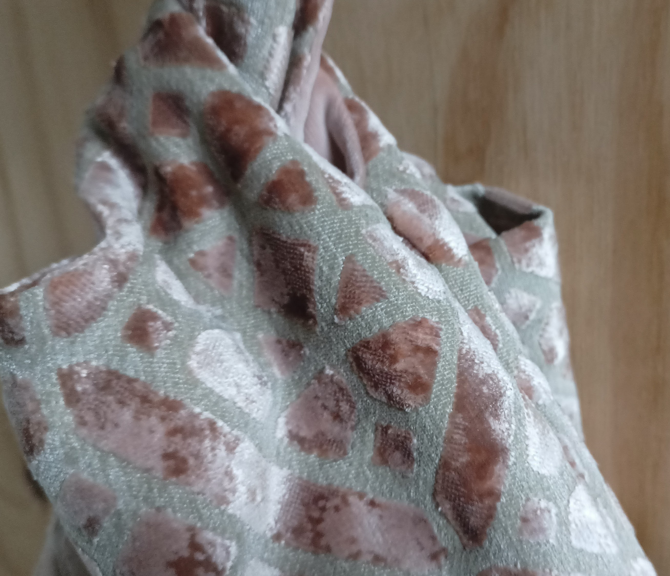 De ene kant is gemaakt van een roze (op een beige achtergrond) velours meubelstofstof met glans in een soort streeppatroon, de andere kant is gemaakt van zeer zacht aanvoelende velours gordijnstof.