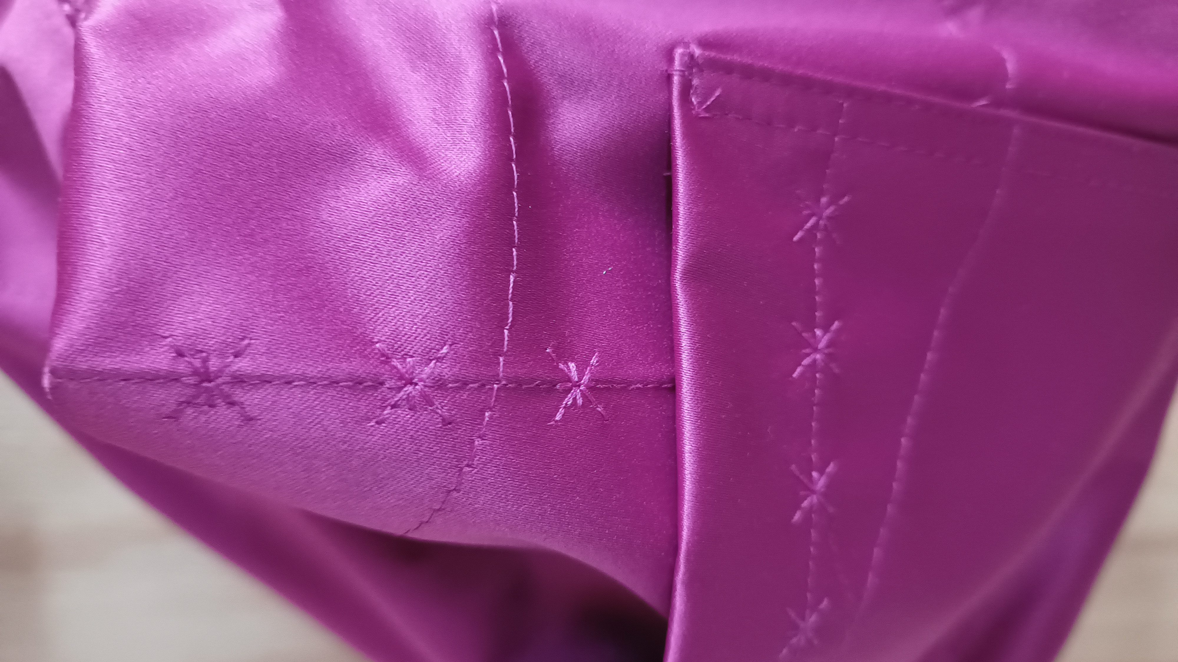 De ene kant is gemaakt van een gladde, glanzende gordijnstof met opstiksels, de andere kant is gemaakt van geweven stevige gordijnstof die heerlijk zacht aanvoelt.