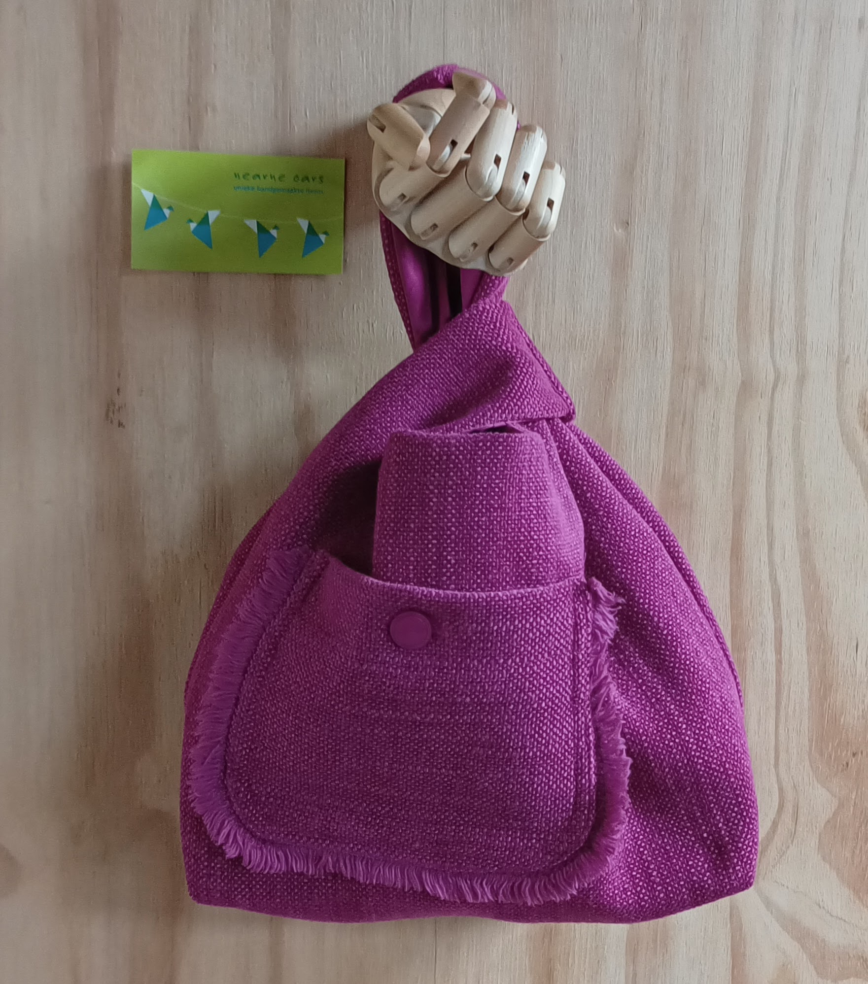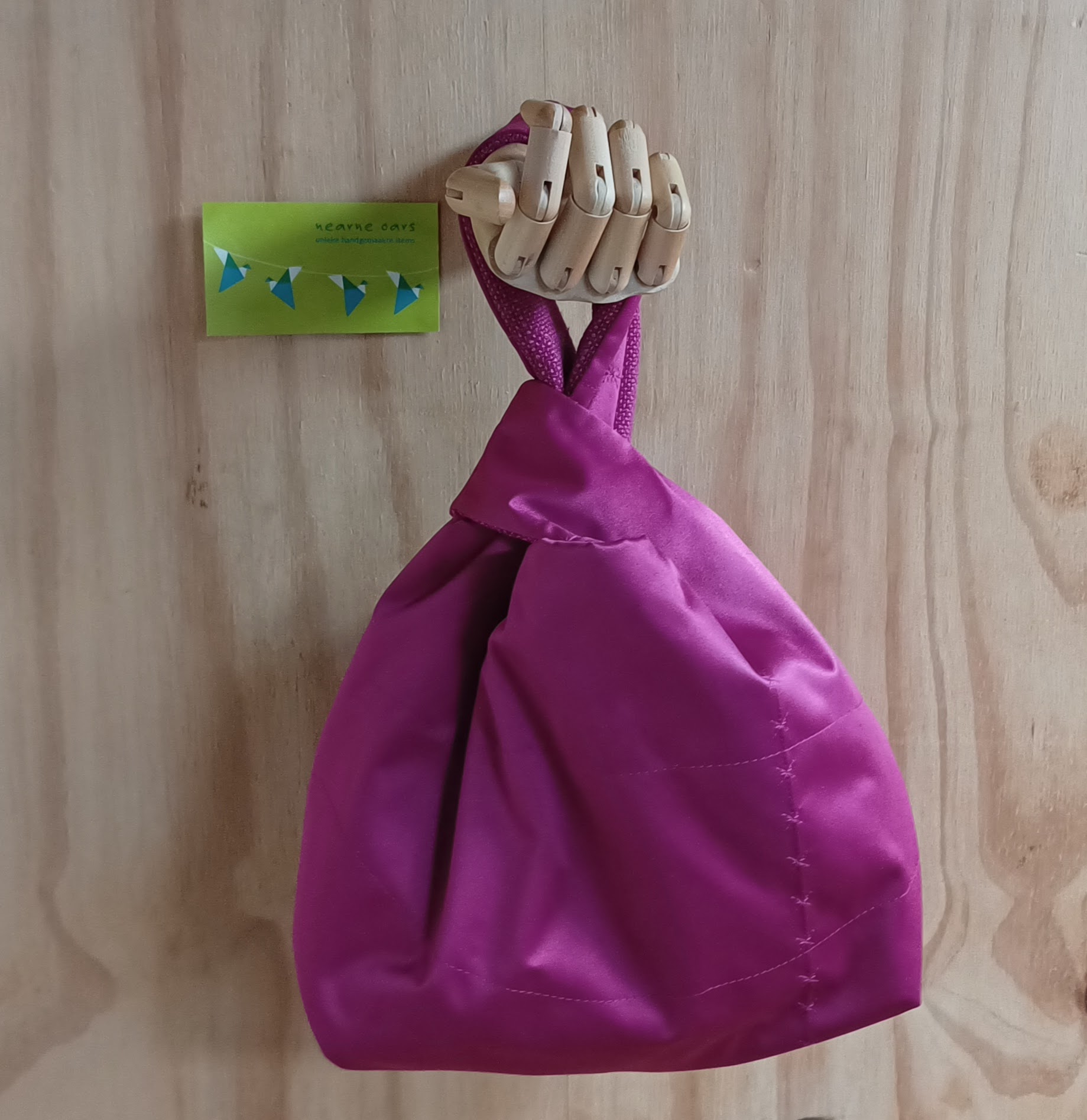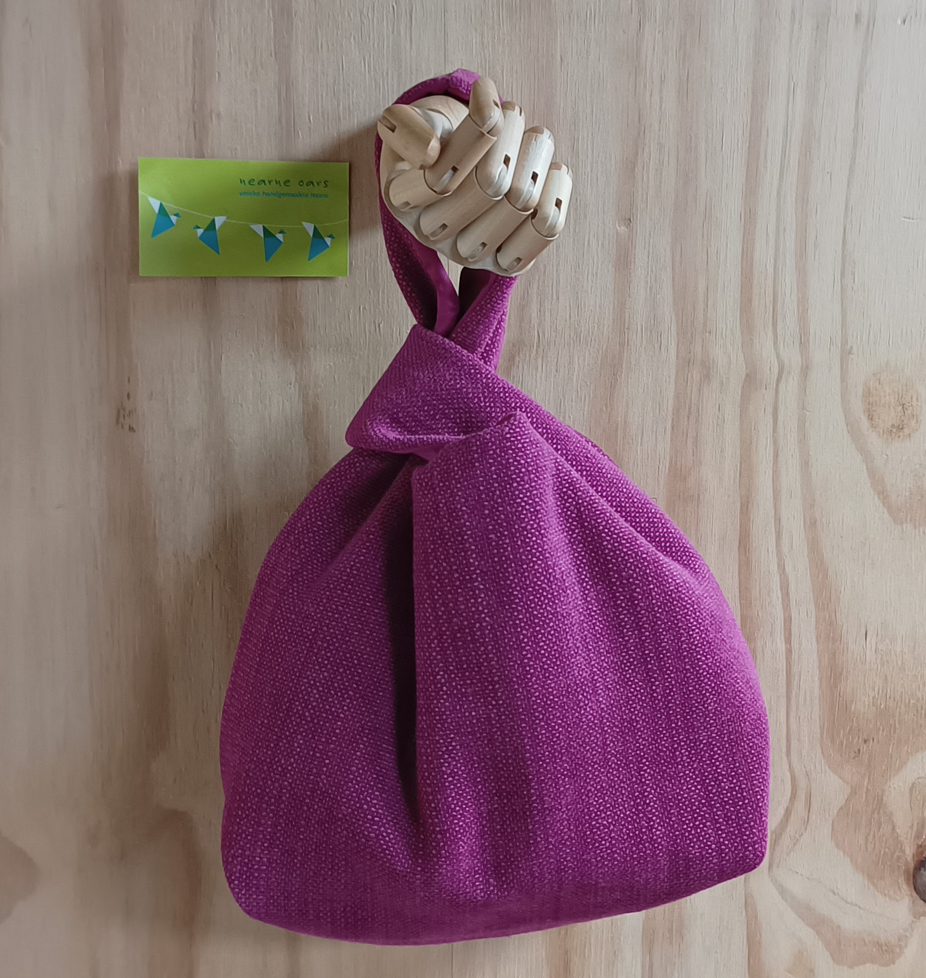 Deze japanese knotbag is uitermate geschikt om mee te nemen naar een feestje. Hangend om de pols of onderarm en je hebt je handen vrij. Het lange hengsel gaat door het korte hengsel en de tas sluit als vanzelf.
