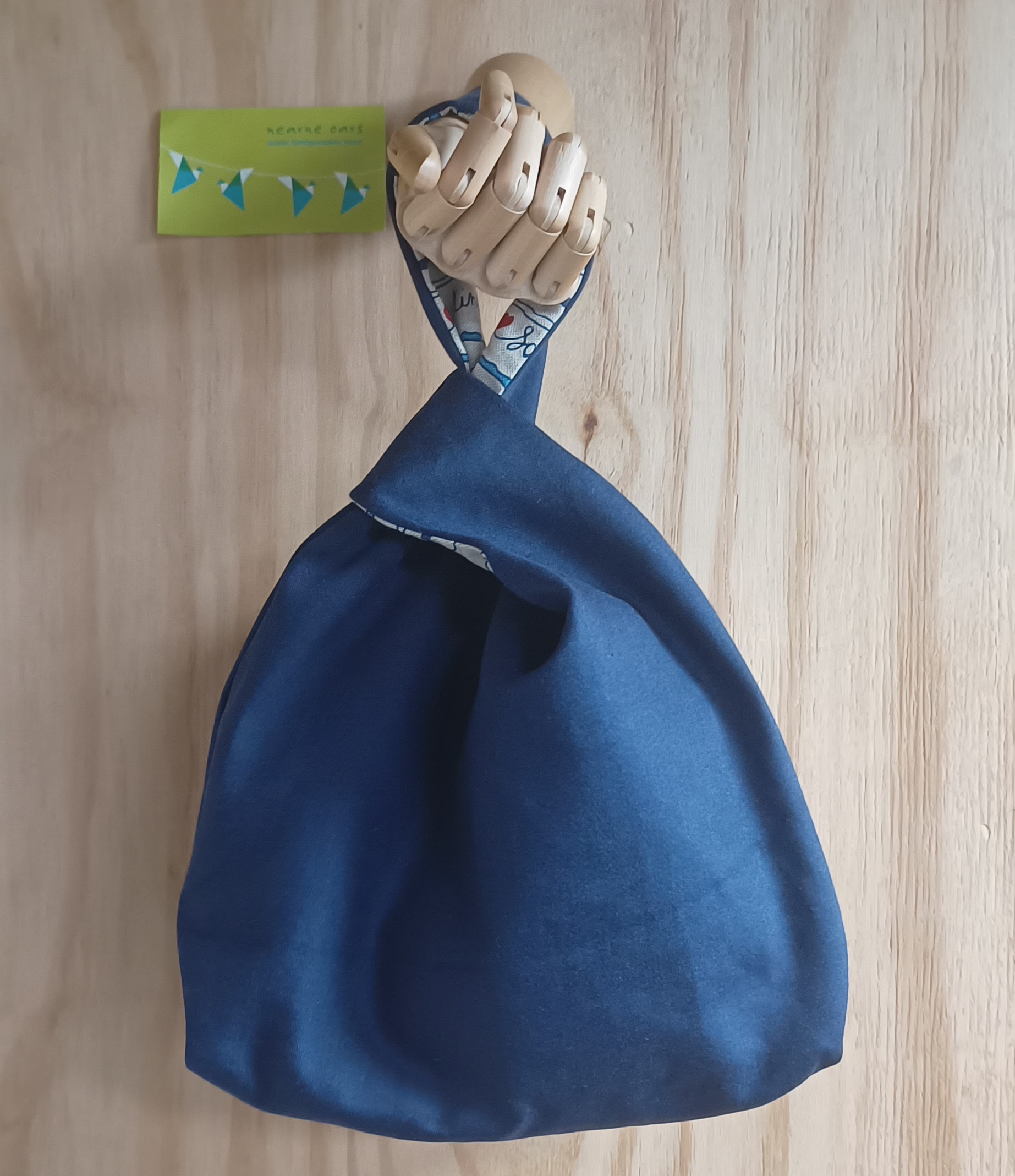Deze japanese knotbag is uitermate geschikt om mee te nemen naar een feestje. Hangend om de pols of onderarm en je hebt je handen vrij. Het lange hengsel gaat door het korte hengsel en de tas sluit als vanzelf.